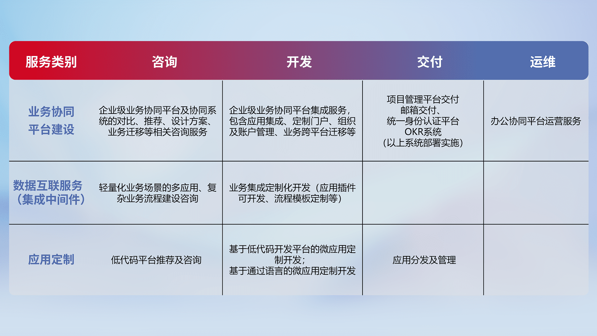 针对钉钉、、、企微、、、、IDaas等平台级产品提供产品的规划、、、、方案、、、、交付、、、定制化开发等服务,,实现如统一协同办公、、智能客户服务、、、混合会议管理、、、、智能数据查询、、等业务场景,,,,实现数字化转型。。